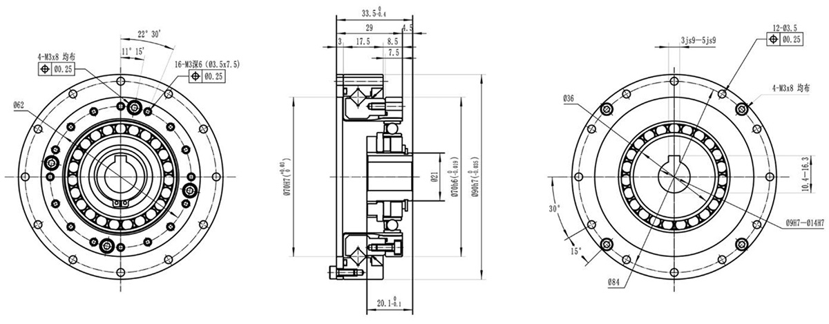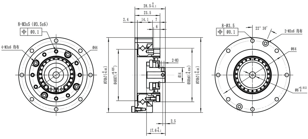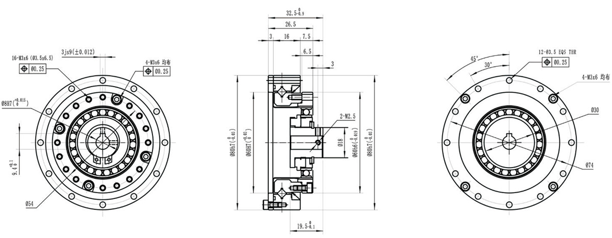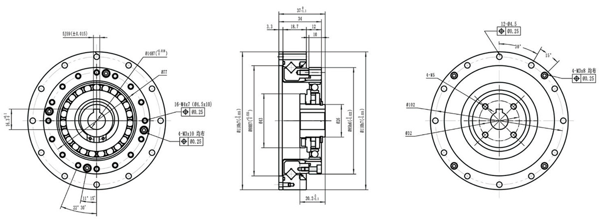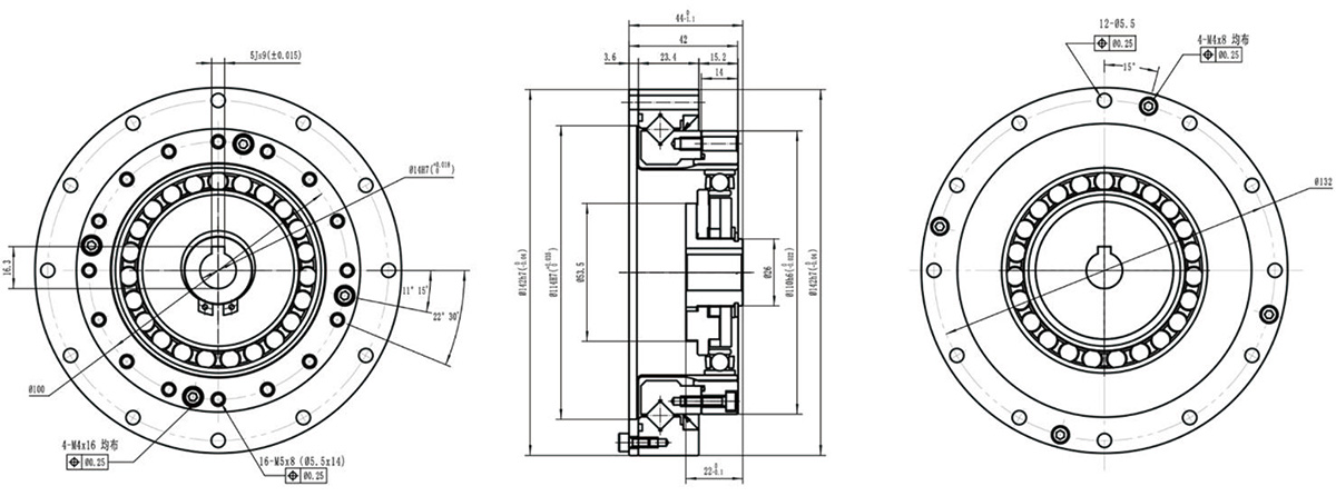 结构扁平紧凑,交叉滚子轴承固定,刚轮、柔轮皆可输出